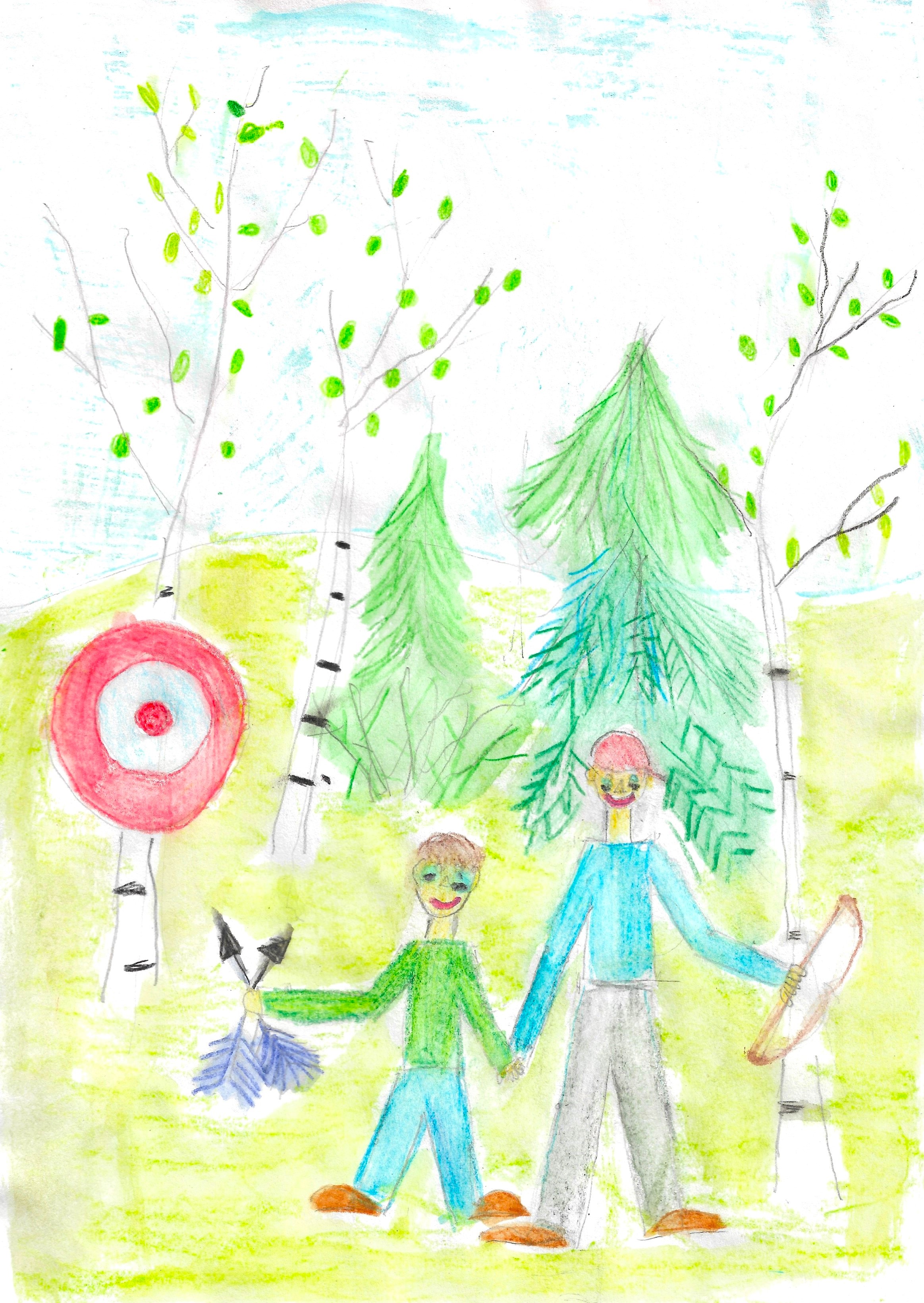 Иллюстрация к повести "Оруженосец Кашка". Соревнования по стрельбе (турнир), Кашка стал оруженосцем Володи. Рисунок выполнен акварельными карандашами.