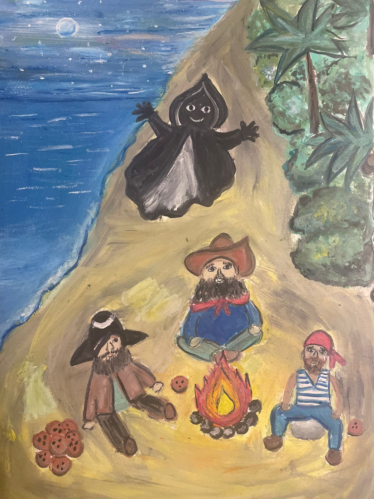 НОЧЬ. ПИРАТЫ СИДЯТ У КОСТРА , КУШАЮТ КОКОСЫ И ДАЖЕ НЕ ПОДОЗРЕВАЮТ , ЧТО ЗА НИМИ ИДЕТ ОХОТА .