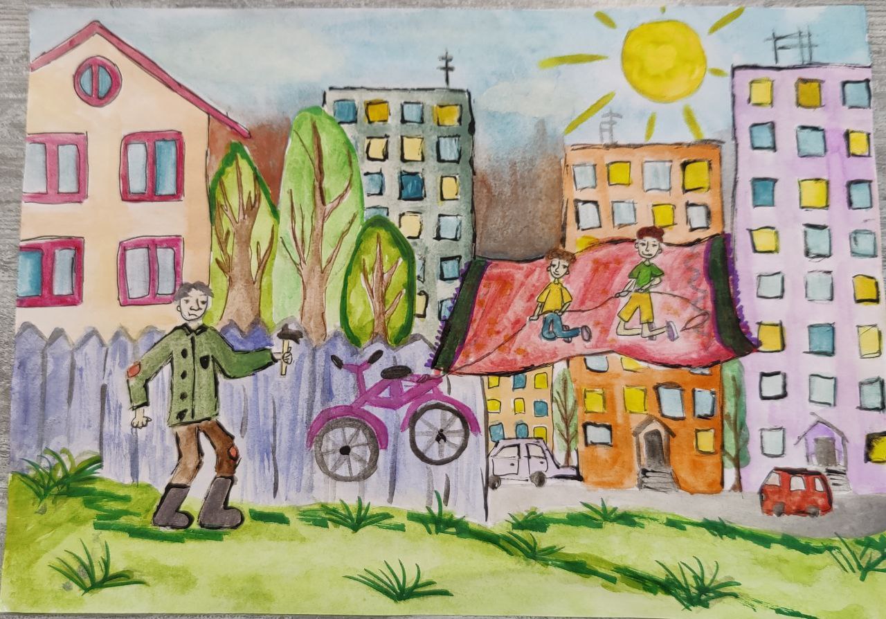 На рисунке изображён ключевой момент повести: мальчик Алёша летит на настоящем ковре-самолёте. Он не один — с ним его верный друг. Они зацепили велосипед, чтобы вернуть его девочке