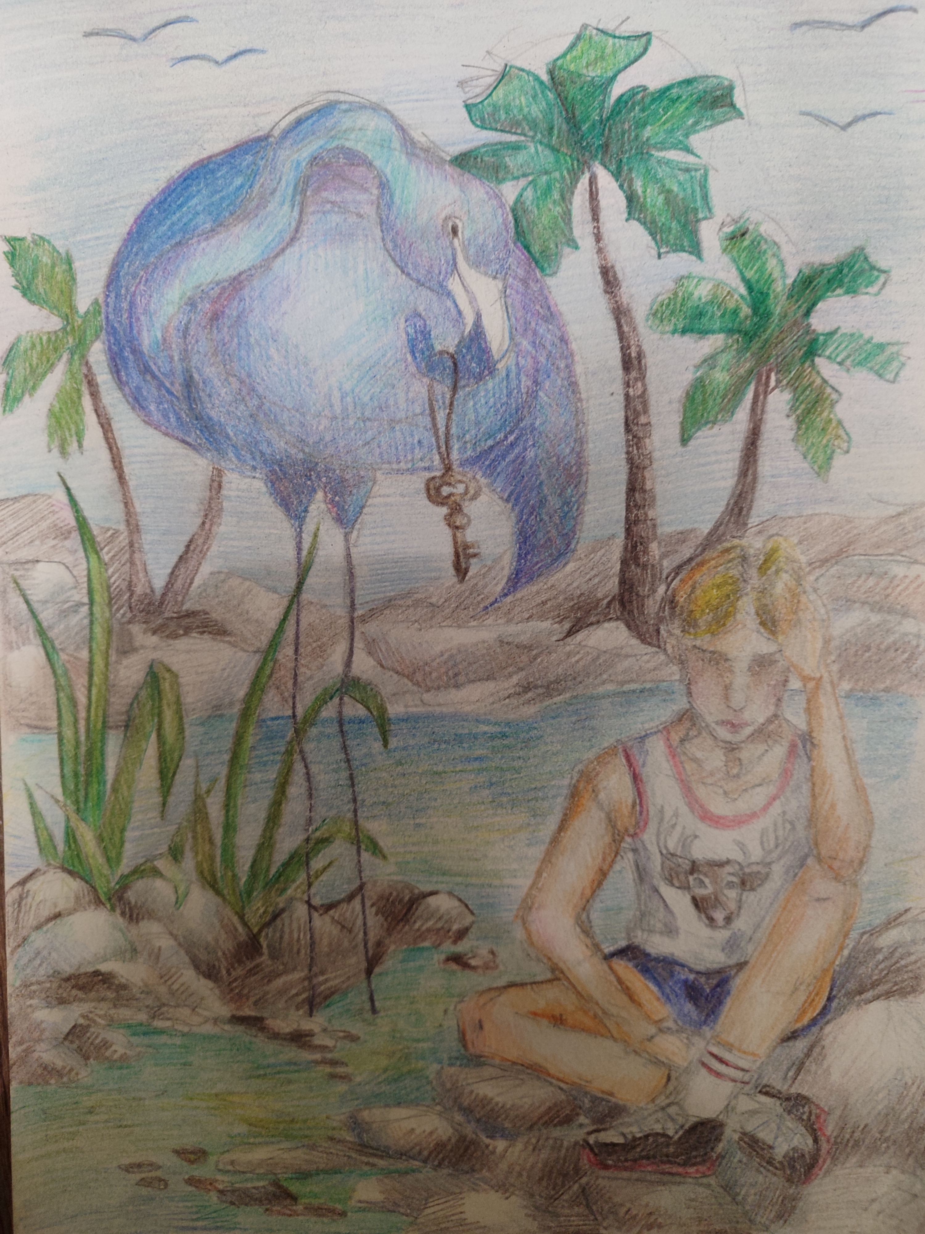 Иллюстрация к произведению "Дети Синего Фламинго". Когда фламинго нашел ключ от дома Жени и отдает его ему. Ключ - это не просто предмет. Он становится символом надежды и напоминанием о реальной жизни, которая ждет его за пределами острова